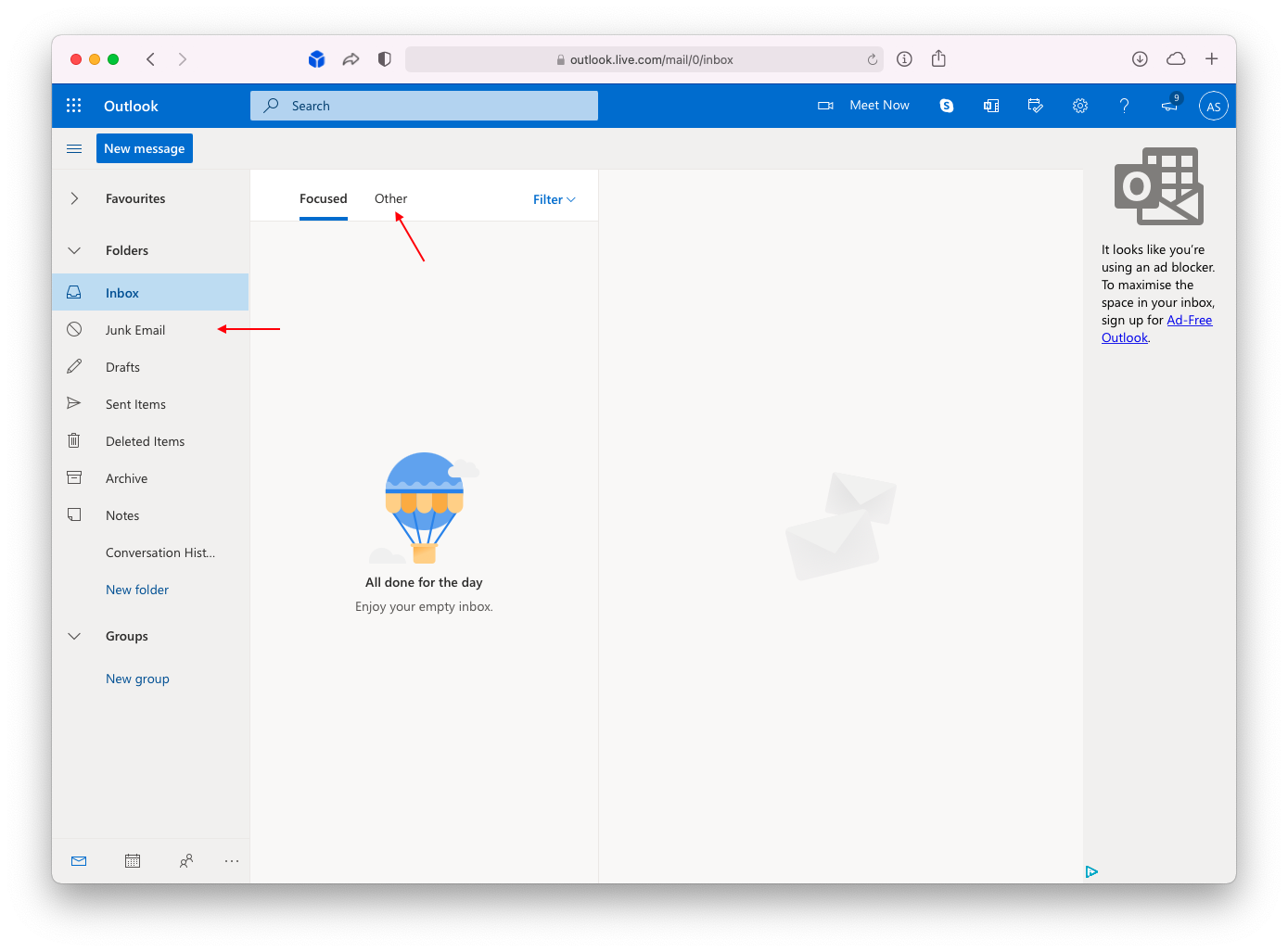2. Click the link for "Safe and Blocked Senders" in the main section of the page under "Junk e-mail"